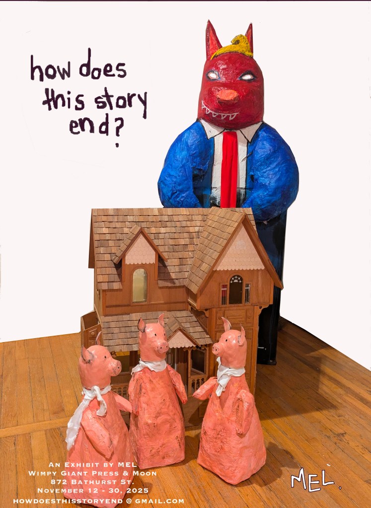 In late 2025, the window display for How Does This Story End was exhibited in Toronto’s Annex Neighbourhood at Wimpy Giant Press & Moon (872 Bathurst St.). Over a three-week period, gallery and bookstore visitors were invited to write and share their perspectives on the exhibit in terms of how they saw this story ending.
